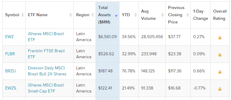 브라질에 투자하는 방법은 한국에서는 펀드밖에 없다. 하지만, 해외주식 투자가 가능하다면 ETF에 투자하는 방법이있다. EWZ의 경우 운용 자산이 65억 달러로 가장 크며, 레버리지를 ETF로는 BRZU가 있다.
