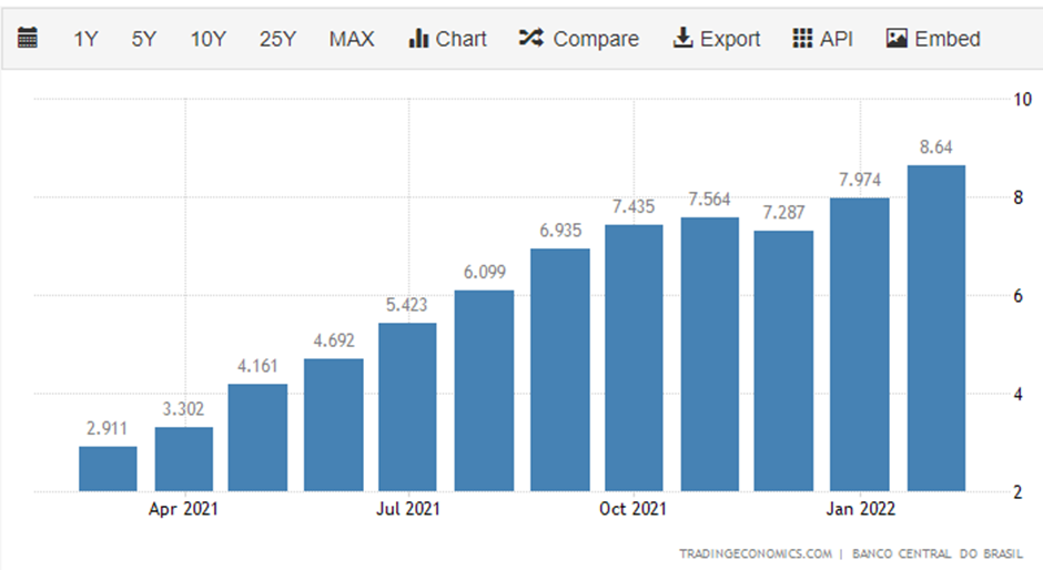 수출이 좋고, 경제가 좋아지는 것으로는 부족하다. 증시가 더 상승하려면 물가도 안정을 찾아야 한다. 그런데, 브라질 근원물가는 최근 중앙은행의 목표치인 3.75%를 벗어나 2022년 2월에는 8.64%까지 상승한 상황이다. 물가가 올라가니 중앙은행은 열심히 금리를 올려야겠고, 현재 11.75%까지 금리가 올라왔다.