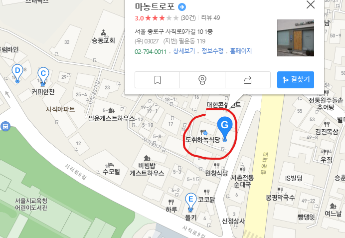 도취 하녹식당은 간판이 매우 크거나 도로변에 있는 것이 아니라 찾기 힘드실 수 있어요. 얼핏 들었더니 옆자리에 계신 분들도 조금 헤매셨더라구요^^.. 도취 하녹식당은 마농트로포라는 카페가 있는 좁은 골목으로 들어가면 있습니다.