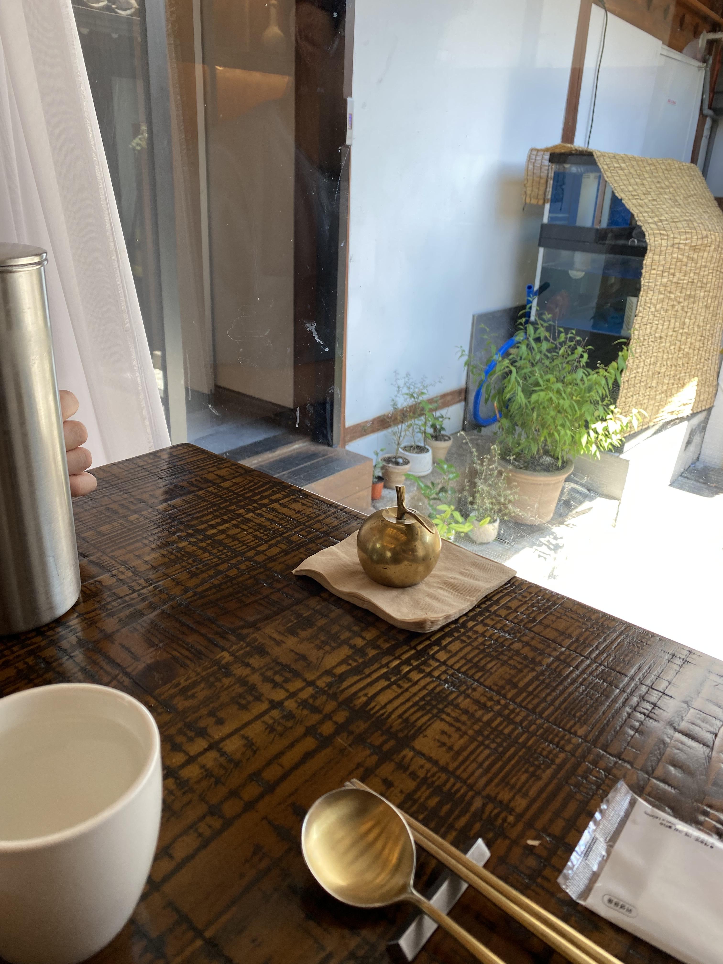 한정식코스 파인다이닝답게 전체적으로 정갈한 분위기가 장점입니다. 일단 처음에 테이블에 앉으면 사과 모양의 종이 기다리고 있어요. 애플에서 받은 협찬은 아니고 서빙하시는 분을 호출할 때 사용하는 종입니다. 내부까지 좌석이 마련되어 있고, 다 드시고 집에 돌아가실 때는 "입춘대길" 밑에서 사진 한장씩 찍고 집에 가면 됩니다.