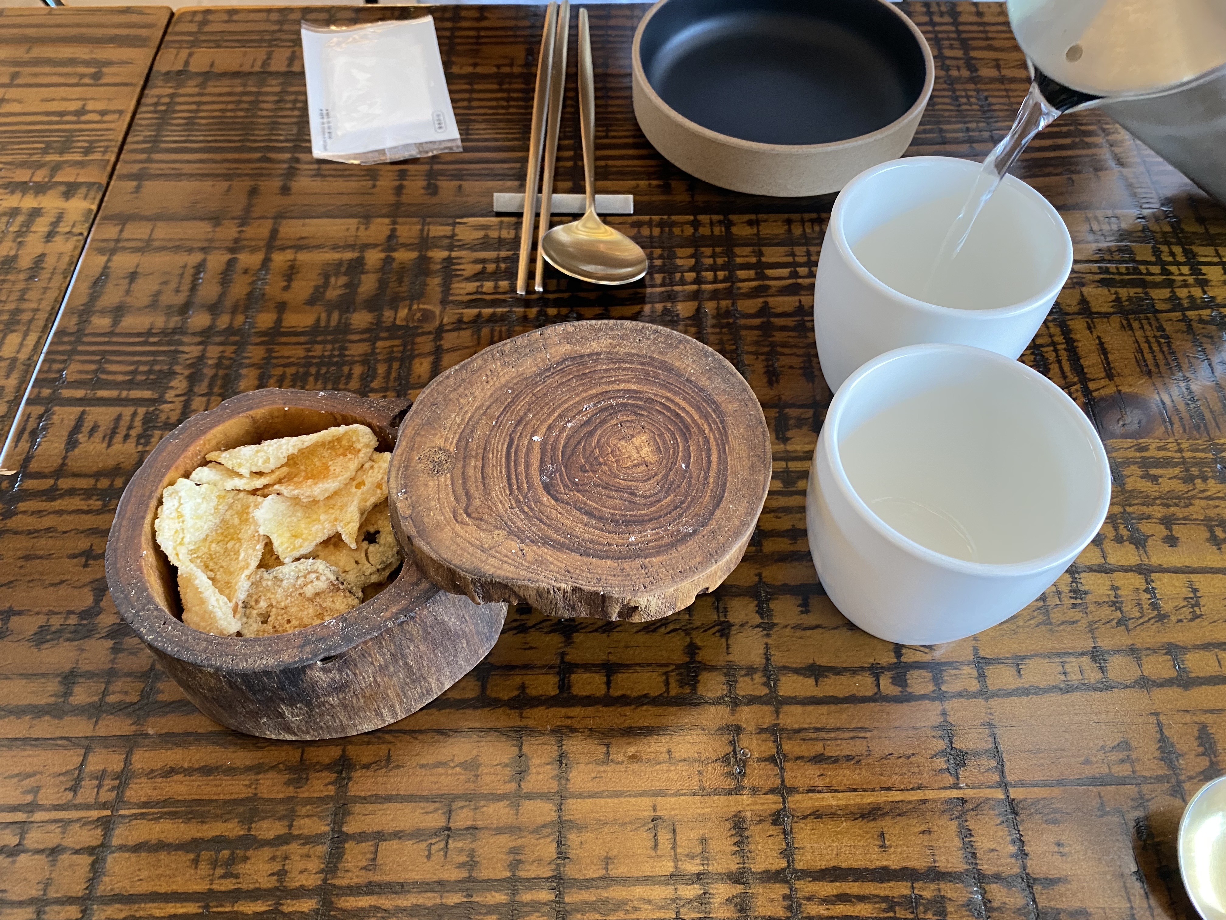 본격적인 메뉴가 나오기 전에 저희 앞에 조그만 나무통이 하나 놓여 있었습니다. 단순 목공예라고 생각하고 있었는데, 서빙해주시는 분이 오셔서 뚜껑을 열어주시더라구요. 안에는 연근과 호박으로 만든 부각이 들어있었습니다. 식감은 전통과자를 먹는 느낌이었고 저는 연근이 맛있었습니다.