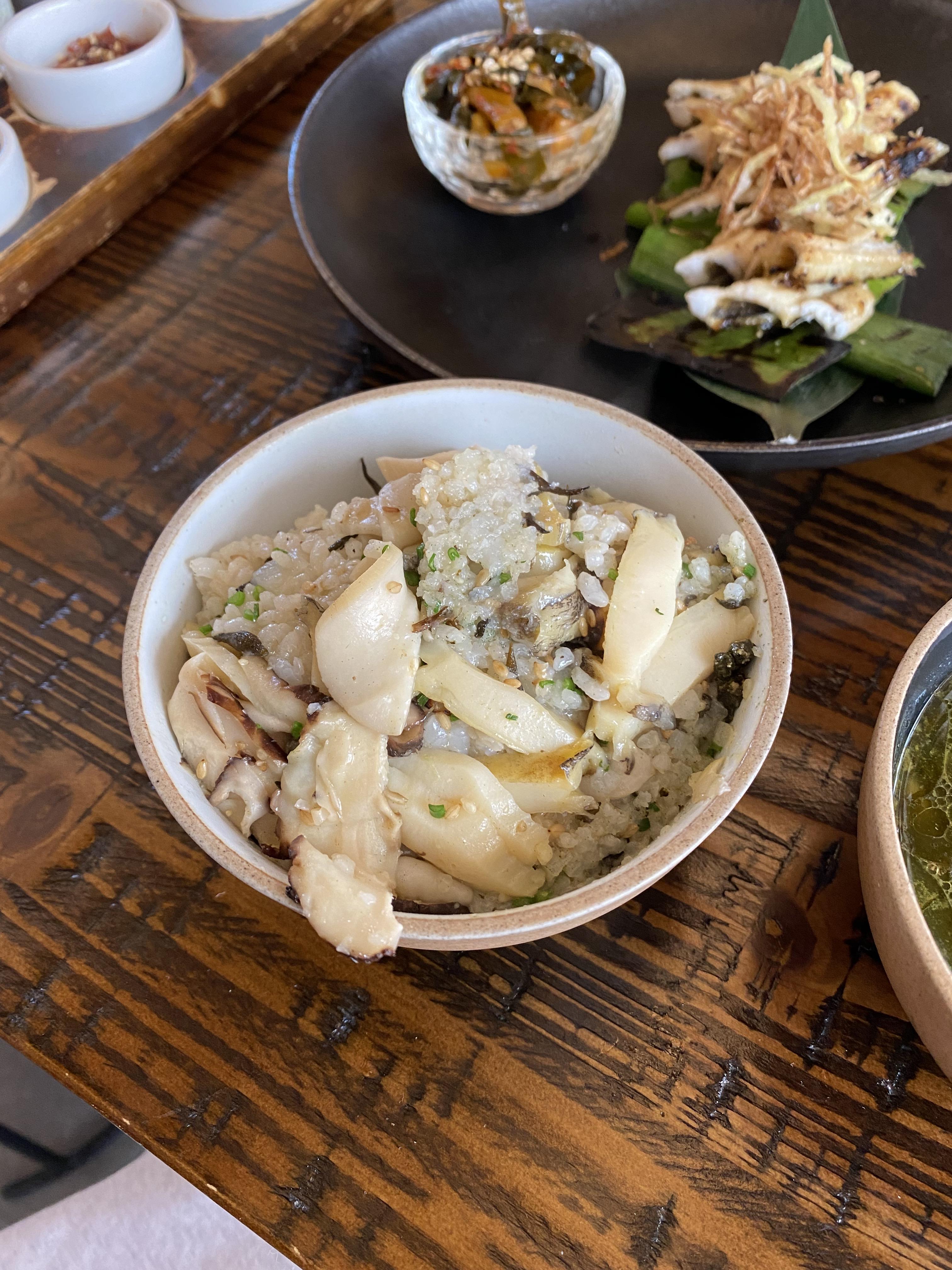 그 다음으로는 편백나무찜과 장어구리를 먹었어요. 장어구리를 다 드시면, 솥밥을 준비해주시는데 솥밥은 직접 서빙하시는 분이 나눠주시고, 숭늉도 만들어주세요. 소고기 미역국이랑 같이 드시면 됩니다. 식사를 마치면 제철과일을 얹은 곶감말이와 아이스크림이 디저트로 준비되어 있습니다. 양이 알차서 점심을 먹었는데 저녁까지 배가 불렀습니다. 일반적인 파인다이닝에서는 기대하기 힘든 양이에요.
