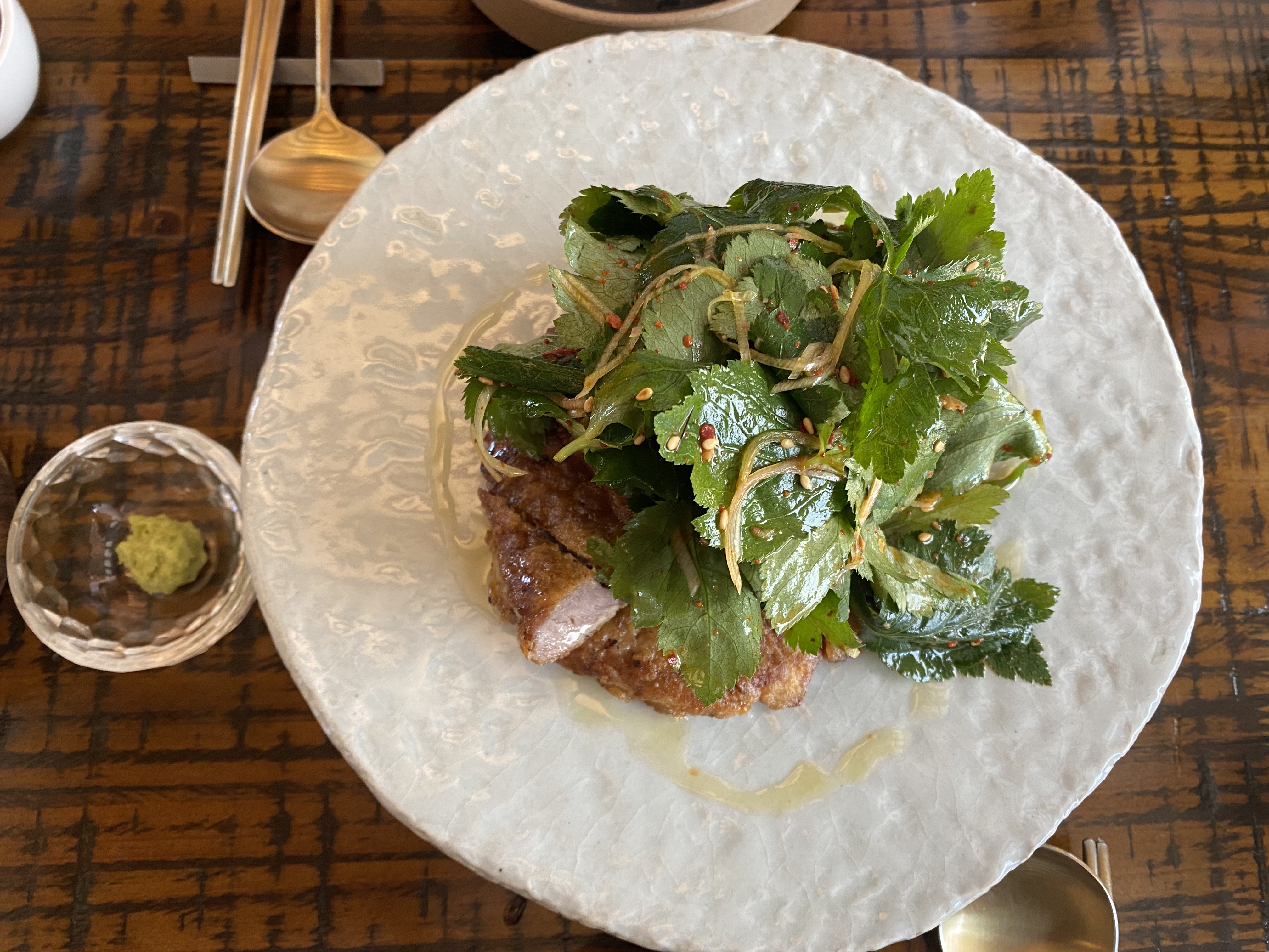 개인적으로 생선회와 참나물 무침을 곁들인 제육저나가 제일 맛있었요. 제육저나는 "임금, 전하" 이런 것인 줄 알았는데, 고기를 전을 만들듯이 만든 것인가봐요 (저의 무지함을 반성합니다). 특히, 참나물이 상큼해서 자칫하면 느끼할 수 있는 제육저나의 맛을 잘 잡아줍니다. 저희는 참나물이 좀 부족했는데, 미리 더 달라고 말씀하시면 많이 주시지 않을까요?