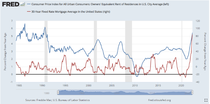 모기지 금리가 상승하면, CPI에서 23%를 차지하는 소유자 부담이 후행적으로 증가하는 경향이 있음. 아래는 30년 고정금리 모기지(미국) YoY 증감율이랑 자가보유 집값 CPI임. CPI 중에서 소유자 집값부담은 당분간 Core CPI에서 상방압력으로 작용할 것. 렌트비는 주택 가격을 1년 뒤에 반영되는데, 샌프란시스코 연은은 주거비 상승이 올해와 내년 소비자물가를 1.1%p 상승시킬 것으로 전망. 6월 주거비가 YoY 5.6% 올랐는데, 1992년 2월 이후 최고 상승률임.