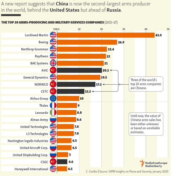 SIPRI에서 2015년부터 2017년까지 중국 기업을 포함해, 상위 20개 군수기업을 추정했습니다. (정확한 데이터가 아니라 추정해야 하는 이유는 중국 기업의 경우 정확한 데이터를 제공하지 않기 때문입니다) 놀라운 건. 세계 2위 무기 생산국가는 더 이상 러시아가 아니라 중국이라는 사실이었습니다