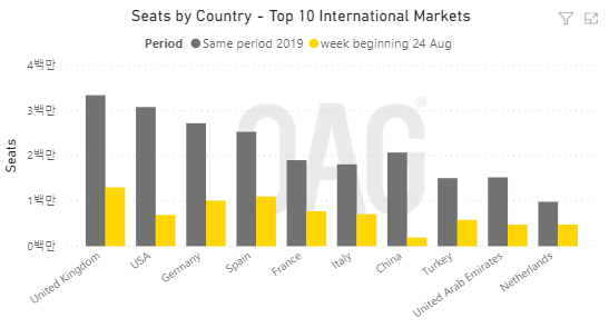 OAG 사이트를 뒤적거리다가 재밌는 사실을 발견했어요. 미국과 중국과 같은 땅덩이가 큰 나라들은 분명히 국내선 수요가 있을 거라고 생각했어요. 모든 나라에서 공통적으로 국내선 운항은 국제선 대비 양호했습니다. 특히, 중국의 8월 넷째주 국내선 운항은 2019년 수준보다 높았습니다! (정확하게 반사이익은 아니지만) 그렇다면 중국의 LCC 업체는 상황이 크게 개선되고 있지 않을까요?