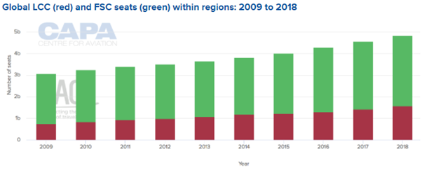 2009년과 비교해서 큰 성장이에요! 2009년에는 2,900대의 항공기가 LCC용 서비스로 날아다녔는데, 거의 2배가 증가했어요. 유효좌석도 2배 가까이 늘었다는데… 2018년에 17억 유효좌석을 공급했대요. 유효좌석은 항공사가 공급할 수 있는 좌석인데, 공장으로 따지면 생산능력(CAPA)라고 보면 됩니다