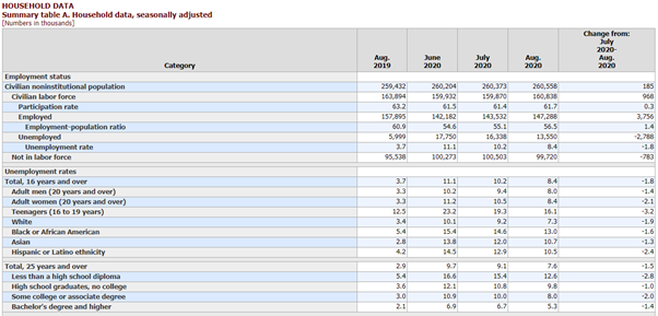여기저기서 하도 강조해서 미국의 실업률과 비농업부문 고용자수 변동이 중요한 것은 많이들 알고 있습니다. 실업률과 비농업부문 고용에 대해서는 여기 미국 노동통계국에서 자세한 내역을 확인할 수 있습니다. 미국의 8월 실업률을 8.4%를 기록했고, 비농업 고용자수 변동은 140만 명 증가를 기록했는데, 이 수치들을 자세히 살펴보겠습니다.