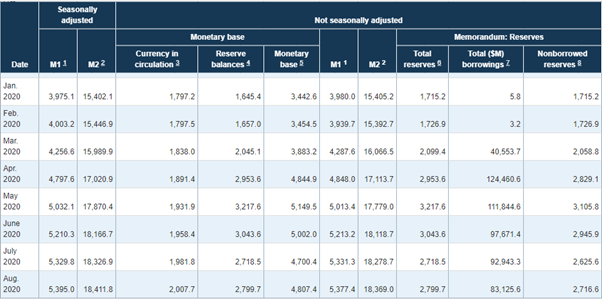2020년 2월 통화승수는 4.45에서 2020년 8월에는 3.82로 감소했습니다. 시중에 돈이 돌고있지 않다는 뜻입니다. Currency in circulation은 유통되는 통화인데, 본원통화가 1조 5000억 달러 증가하는 동안, 고작 2000억 달러가 증가했습니다. 유동성은 풍부하지만, 함부로 돈을 빌려주기 어려운 상황임을 반증하기도 하고, 경제가 좋아질 때, 이 돈들이 풀리면 자산 시장이 엄청난 랠리를 보일 수 있다고 예상할 수도 있겟습니다.. (개인적인 생각입니다)